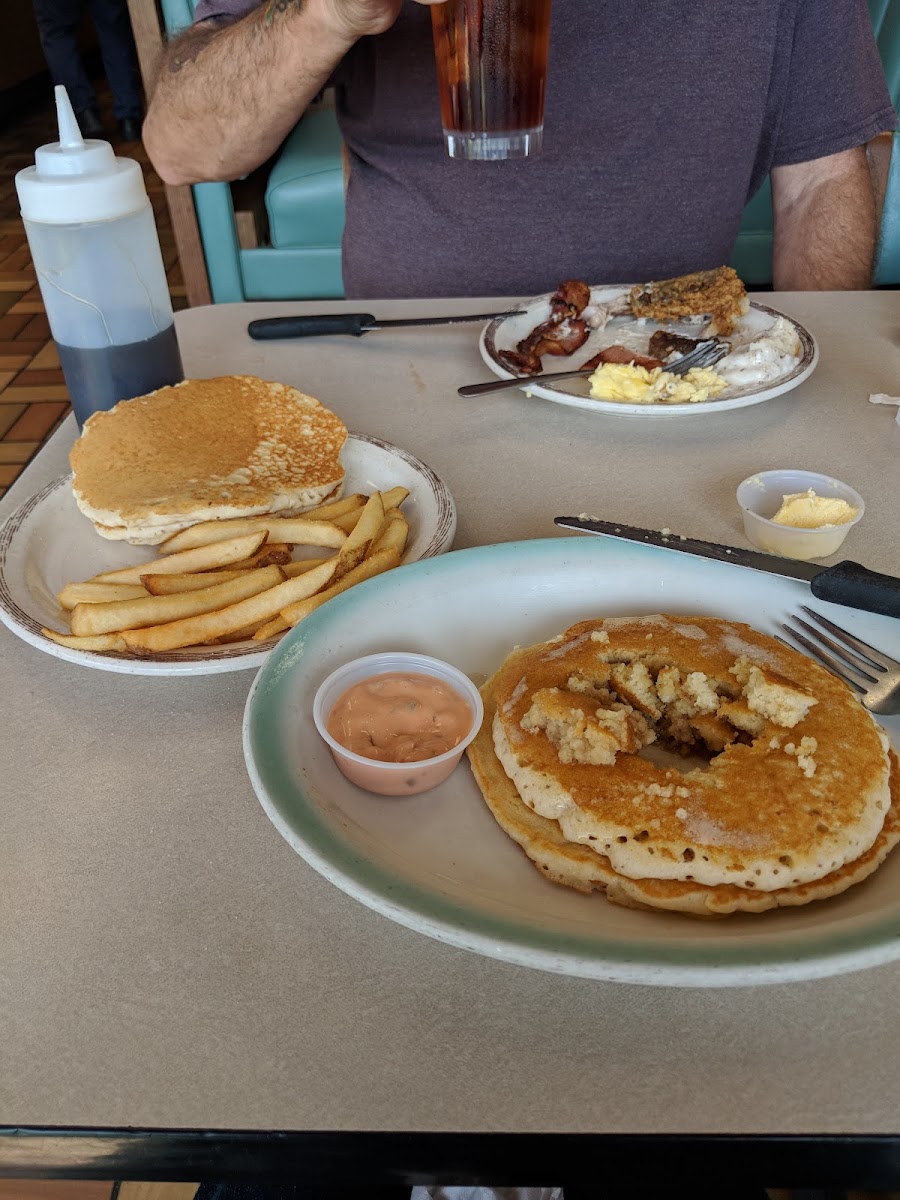 The menu is exactly what you want from a classic American diner. Breakfast is the big draw, with eggs cooked to order, biscuits that don’t crumble into dust, and pancakes that land somewhere between fluffy and filling. Lunch and dinner lean into comfort food, with burgers, country-fried steak, and homestyle sides like green beans and mashed potatoes. During one visit, I watched a family at the next table split a sampler platter, which is a smart move if you want variety without overordering.
